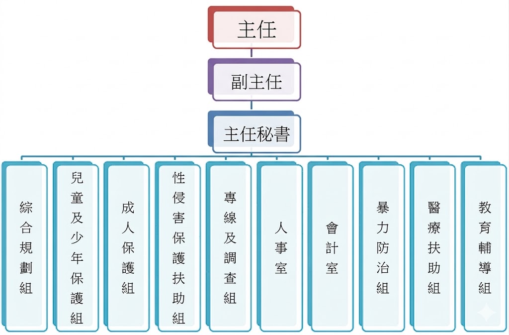 本中心設有主任1人、副主任1人及主任秘書1人,下設綜合規劃組、兒童少年保護組、成人保護組、性侵害保護扶助組、專線及調查組、人事室、會計室、暴力防治組、醫療扶助組、教育輔導組等,分別掌理下列事項: